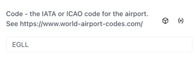 "inputs": [ { "name": "code", "type": "get", "label": "Code - the IATA or ICAO code for the airport. See https://www.world-airport-codes.com/", "description": "IATA codes are three-letter identifiers used in ticketing and passenger systems, while ICAO codes are four-letter identifiers used by air traffic control" }, { "name": "format", "type": "get", "default": "json", "label": "Optional. The format of the dataset to return", "description": "The format of the dataset to return" }, { "name": "limit", "type": "get", "default": 10 }]When no “label” property is set, the input field will show the name: