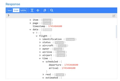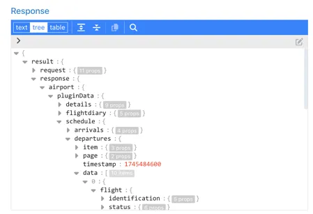 Section titled “Arrival Scheduled Arrival Time”The scheduled arrival time is also in the “flight” section of the response under ..time.scheduled.arrival: