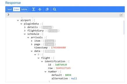Section titled “Arrival Flight Number”The flight number of arriving flights is found under the ..schedule.arrivals.data.0.flight.identification.id